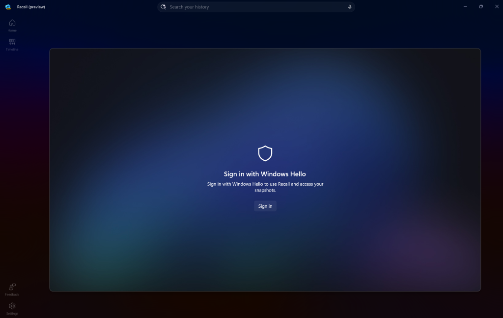 screenshot of Recall requiring Windows Hello authentication before accessing your data