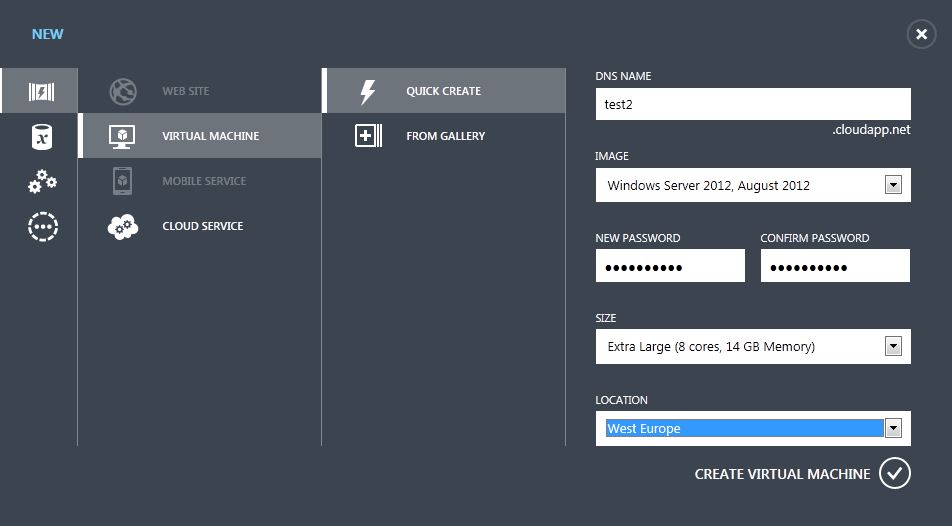 My portal (which can be accessed by going to https://manage.windowsazure.com) was ready to use, now I want to create my Virtual Machine. For that I pressed the + button and did a quick create of a virtual Machine. The only details I was asked to create the VM were: DNS name, image I wanted to use (selected Windows 2012), administrator password (password complexity is required!), size (for extra-small to extra large) and the location where I want to host this machine. I always think big so I selected Extra Large as size!