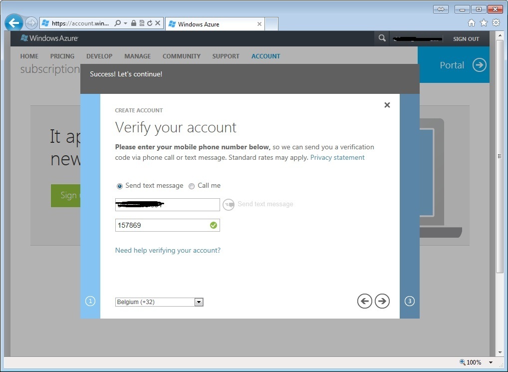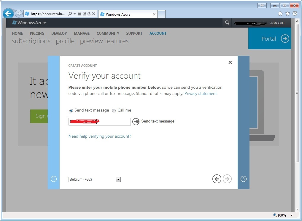 To complete the registration you are required to have a mobile phone and a valid credit card near you. Next step is to provide your (mobile) phone number. Microsoft requires this as they send you an account verification number for completing the account registration. I provided my phone number and selected my country and went further with the registration process by pressing the arrow pointing to the right.