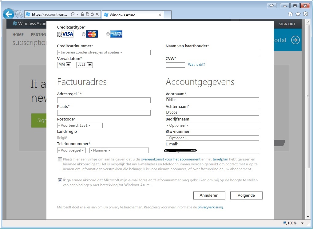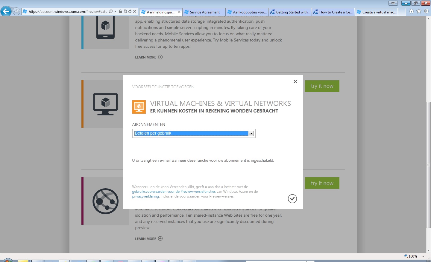 My next step was to create a “pay by use” subscription. As I want to create a VM which I intent to use for a very short time, I only want to pay for that VM the time that I’m using it. Creating a pay by use subscription can be done in your account centre (add subscription). Next I need to subscribe for the function “Virtual Machines”. This can be done in the account centre as well using the option “Example of functions”. (“Voorbeeld van functies” in dutch). Scroll down to “Virtual Machines” and press the button “Try it now”. Next select your “pay by use” subscription and confirm.