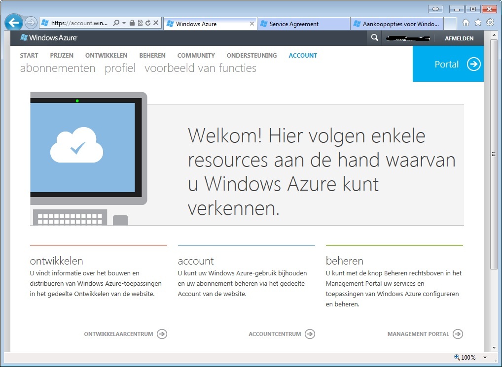 et voila! our Azure acount is ready for use! If all goes well next screen you’ll see is the main welcome screen for Azure. Note that the website is shown in the language of your computer’s localization setting (Dutch – Belgium in my case).