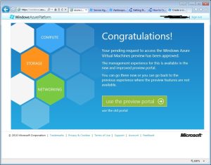Once confirmed I was asked to use the preview version of the administration center of Azure, which I confirmed by pressing the green “Use the preview portal” button.
