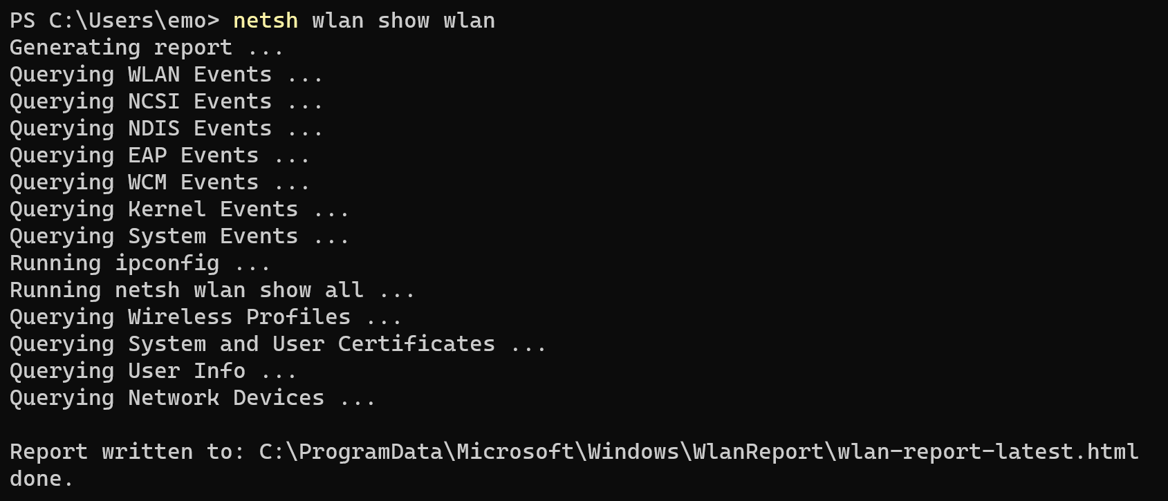Fastest way to access the report is to copy & paste the C:\ProgramData\Microsoft\Windows\WlanReport\wlan-report-latest.html back into the prompt window & press enter