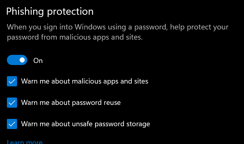 Phishing protection is turned off every build upgrade: (Feedback Hub: https://aka.ms/AAi6ain)