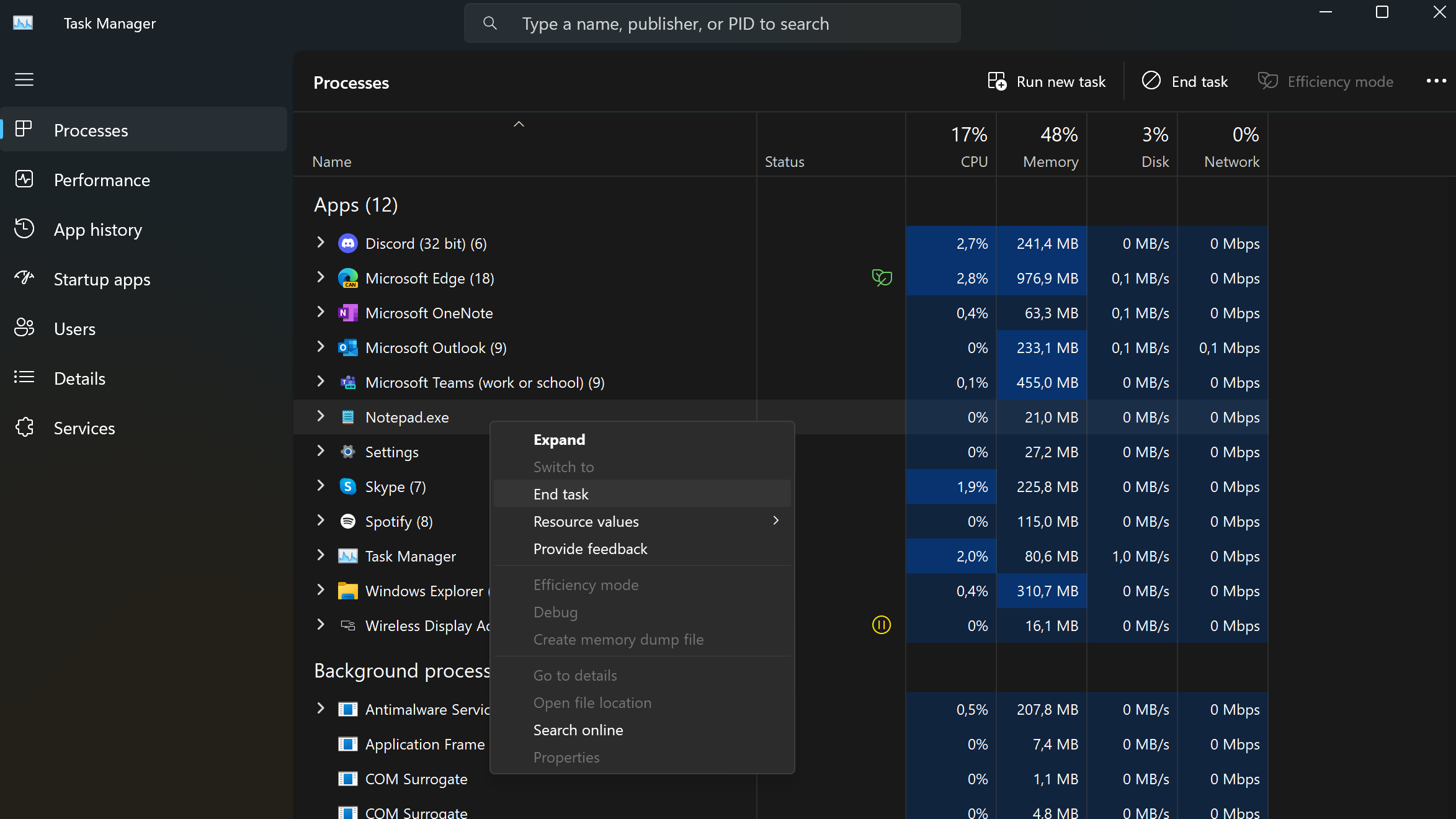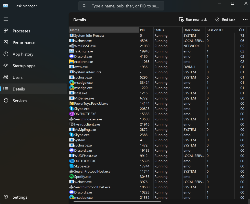 One of the features of the Windows Task Manager is that it automatically refreshes the data every few seconds. This can be useful for monitoring the performance and activity of your system, but sometimes you may want to pause the refresh for various reasons. For example, you may want to examine a particular process or service more closely, or you may want to take a screenshot of the current state of your system. To stop the refresh, you can use a simple keyboard shortcut: holding down the Ctrl key while the Task Manager window is active. This will freeze the data until you release the Ctrl key. very useful when in details view, sorted by CPU usage to stop the processes from jumping up and down the list