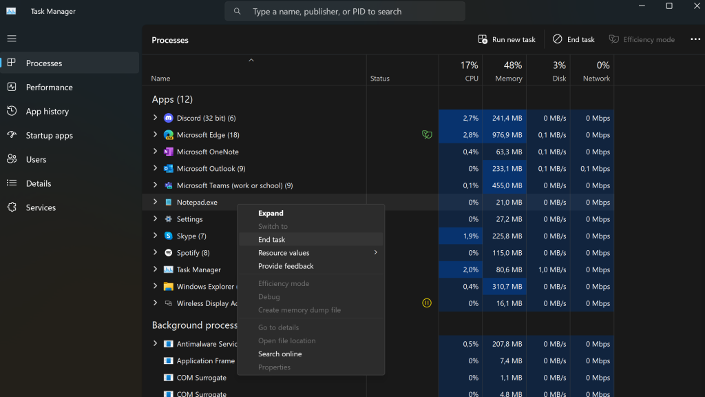 One way to launch a new program without closing the task manager is clicking on the run new task option. This will open the create new task window (also known as run) For example, if you want to open Notepad, you can type notepad.exe and press enter. The program will start in the background and you can switch to it using the task manager or the taskbar. Holding down the ctrl key prevents the task manager from closing when you run a new task, which can be useful if you need to monitor the performance or processes of your system.