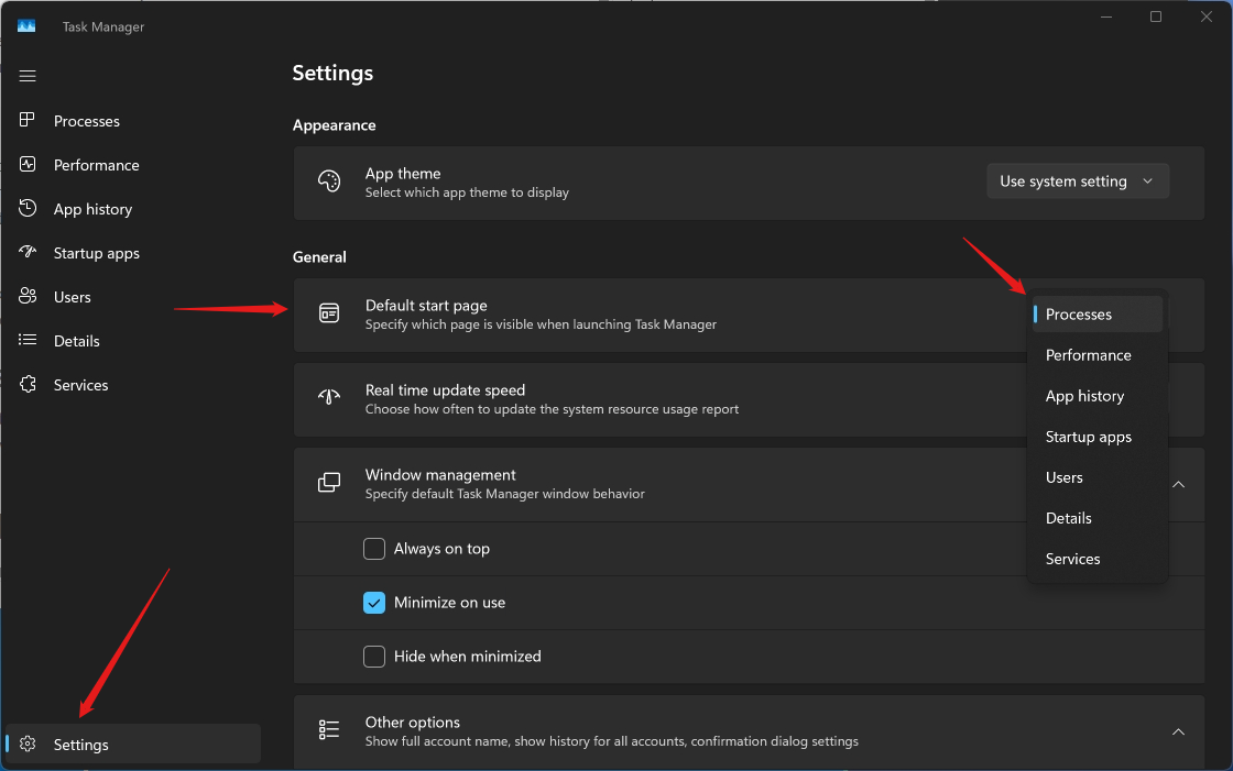 To set a different page to appear when you launch Task Manager, open the settings menu at the bottom left of Task Manager and select Default Start Page. Then, pick the page you prefer from the dropdown menu.