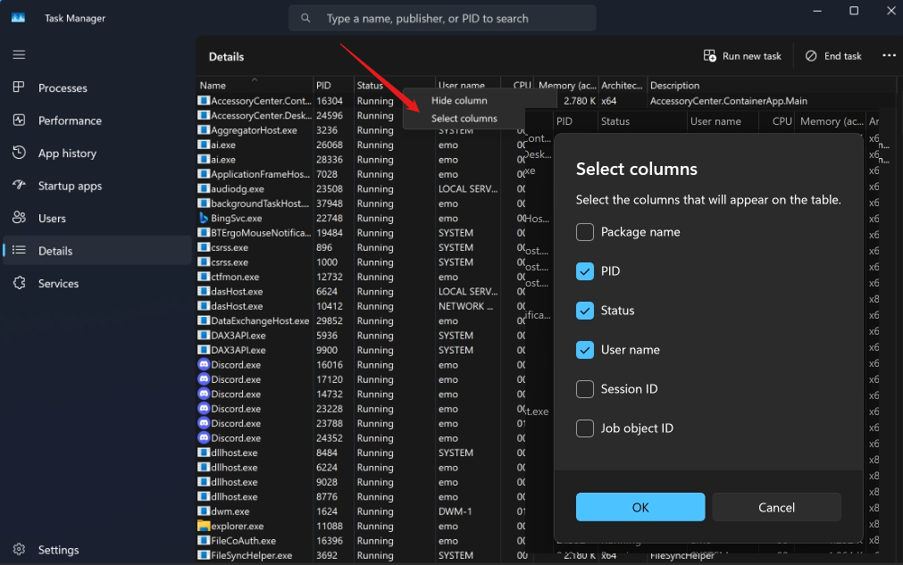Task Manager has many more columns that you can add to the processes tab, depending on what information you want to see. For example, you can add columns for PID, command line, description, status, UWP context, and more. To add more columns, right-click on any column header and select hide column or show columns to check the boxes next to the columns you want to see.