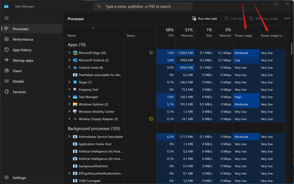 If you are using a laptop or tablet, you may want to keep an eye on your battery life and power consumption. Task Manager can help you with that, by showing you how much power each app is using. To see this information, you need to add the Power usage and Power usage trend columns to the processes tab.